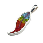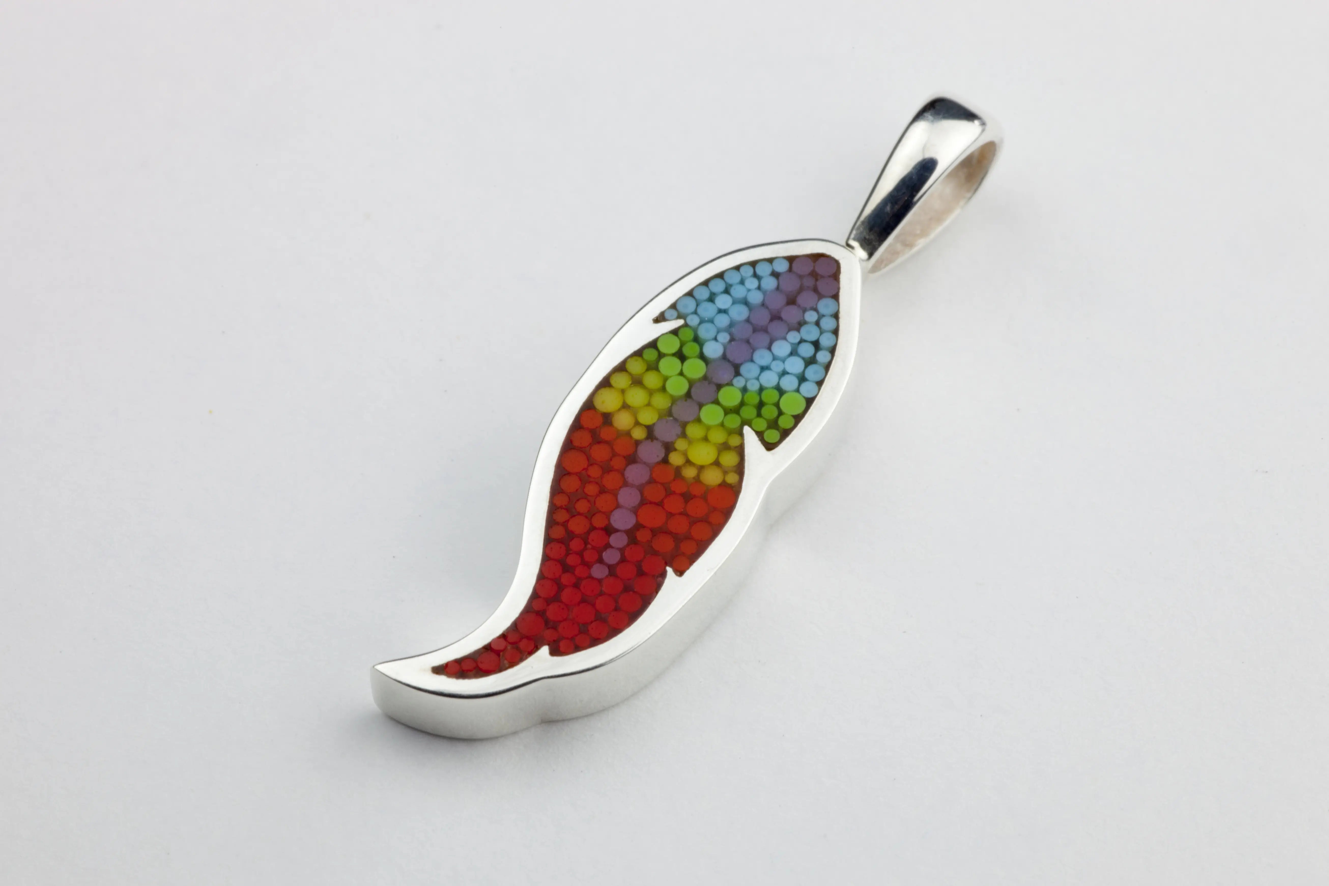 Pendentif Plume 1 en argent sterling et micro-mosaïque de verre, avec chaîne en argent sterling.