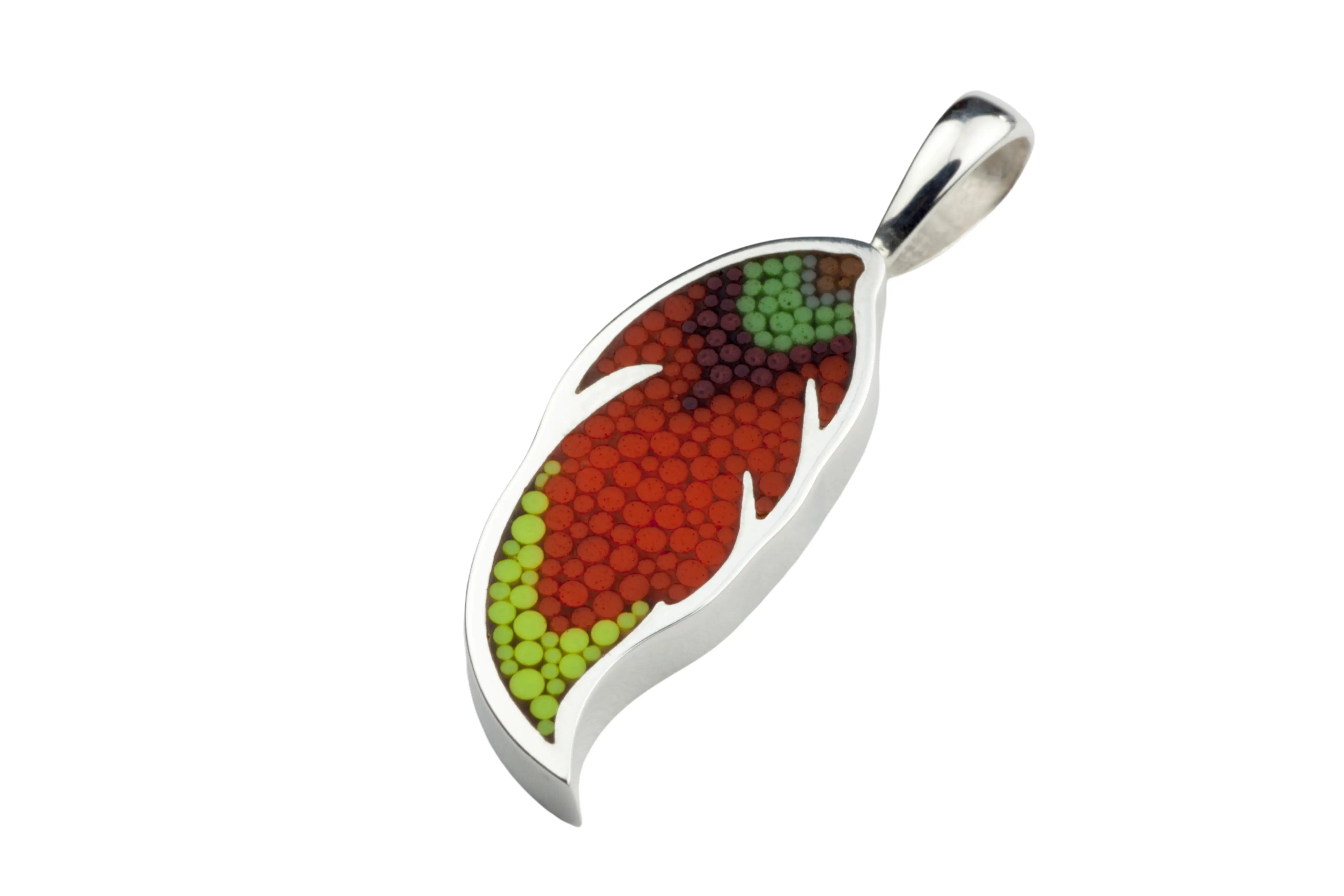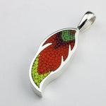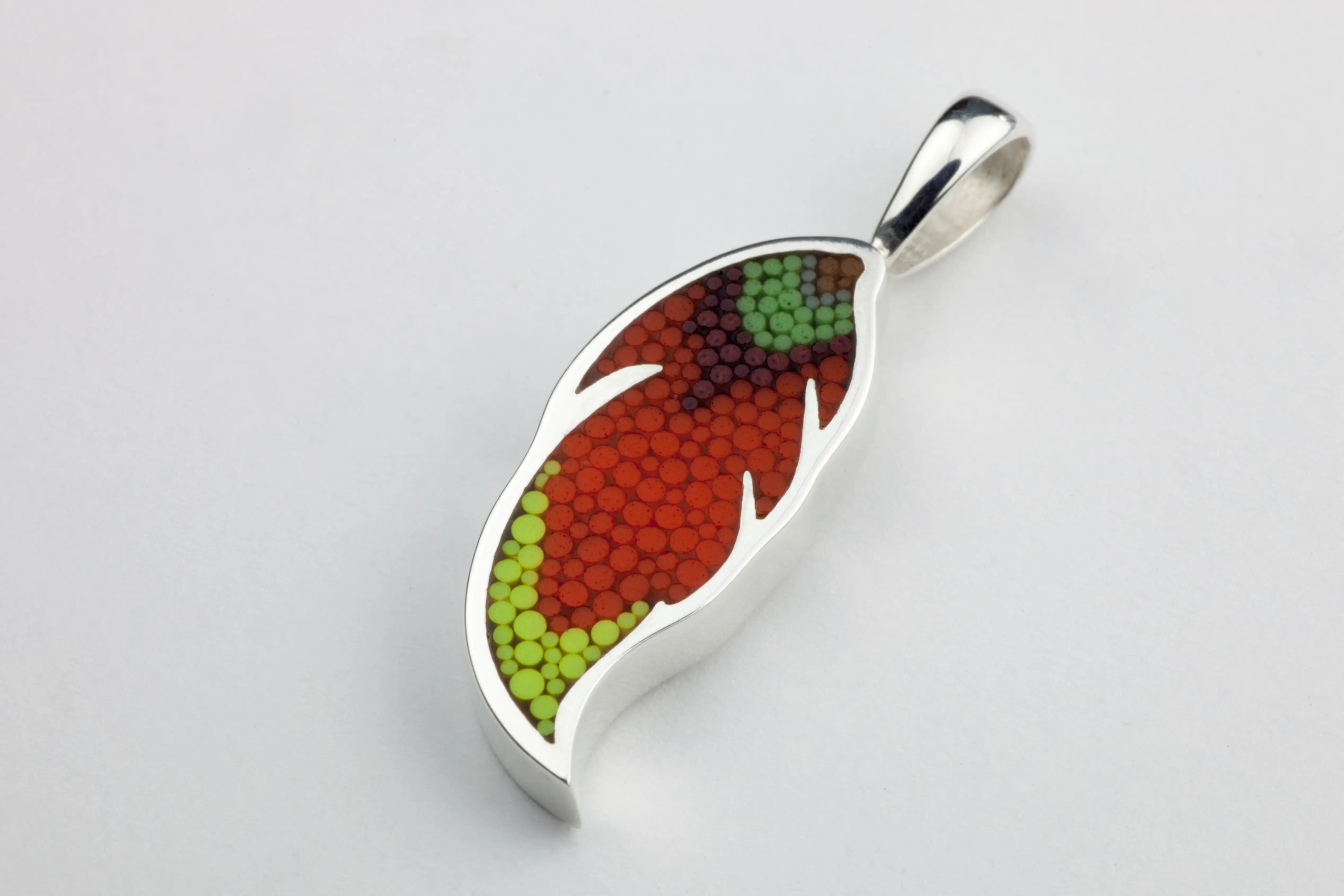 Pendentif Plume 11 en argent sterling et micro-mosaïque de verre, avec chaîne en argent sterling.