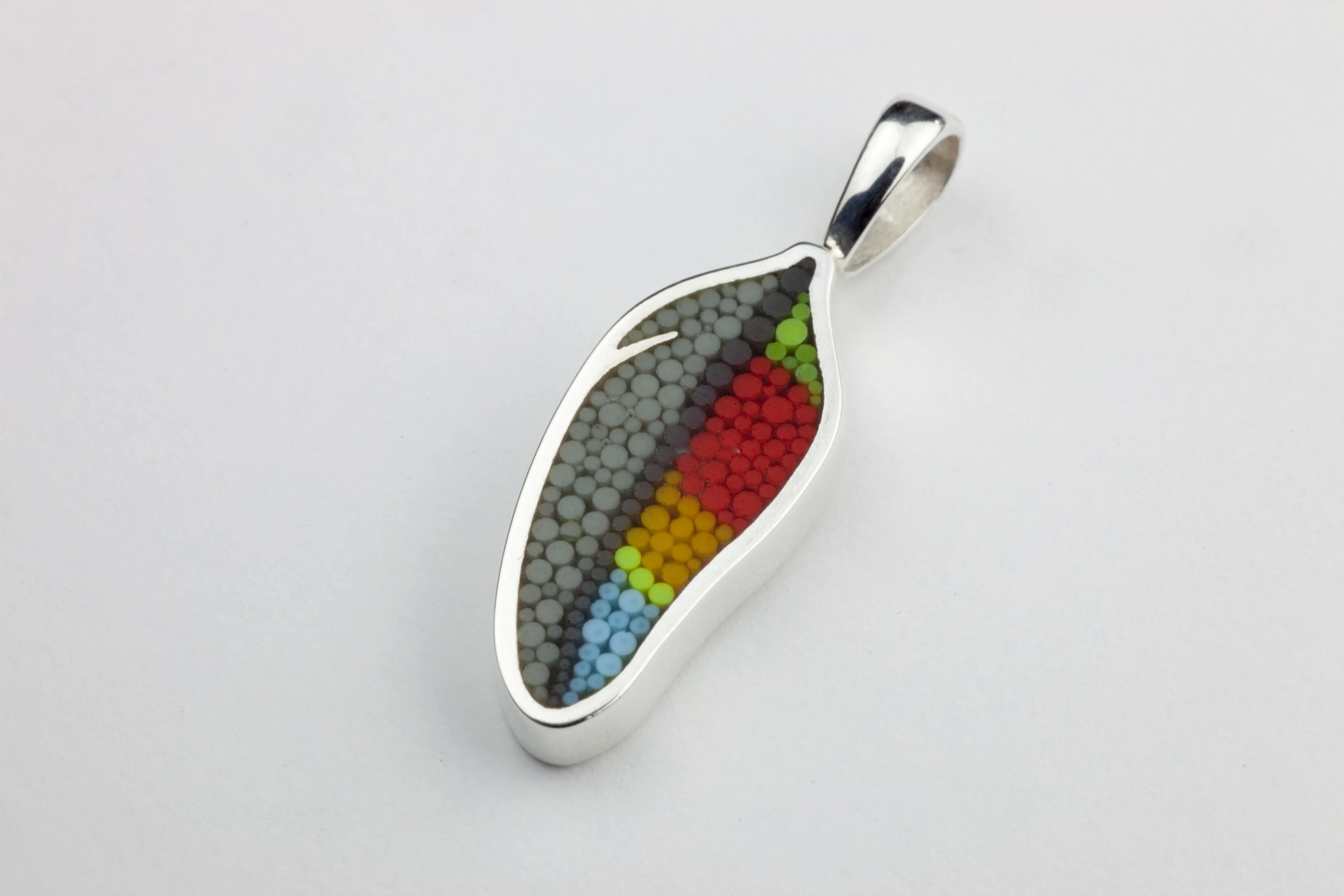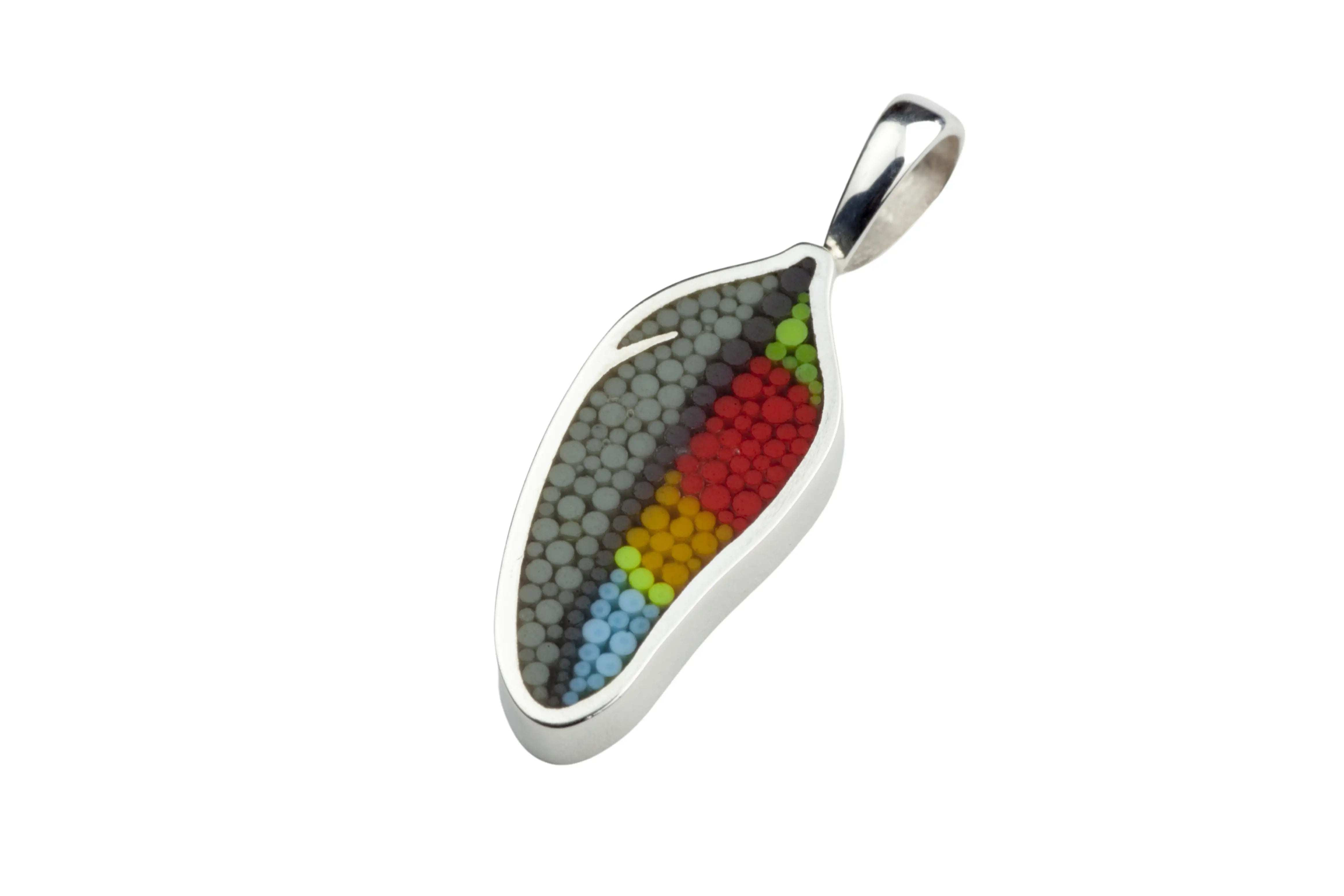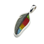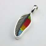 Pendentif Plume 12 en argent sterling et micro-mosaïque de verre, avec chaîne en argent sterling.