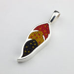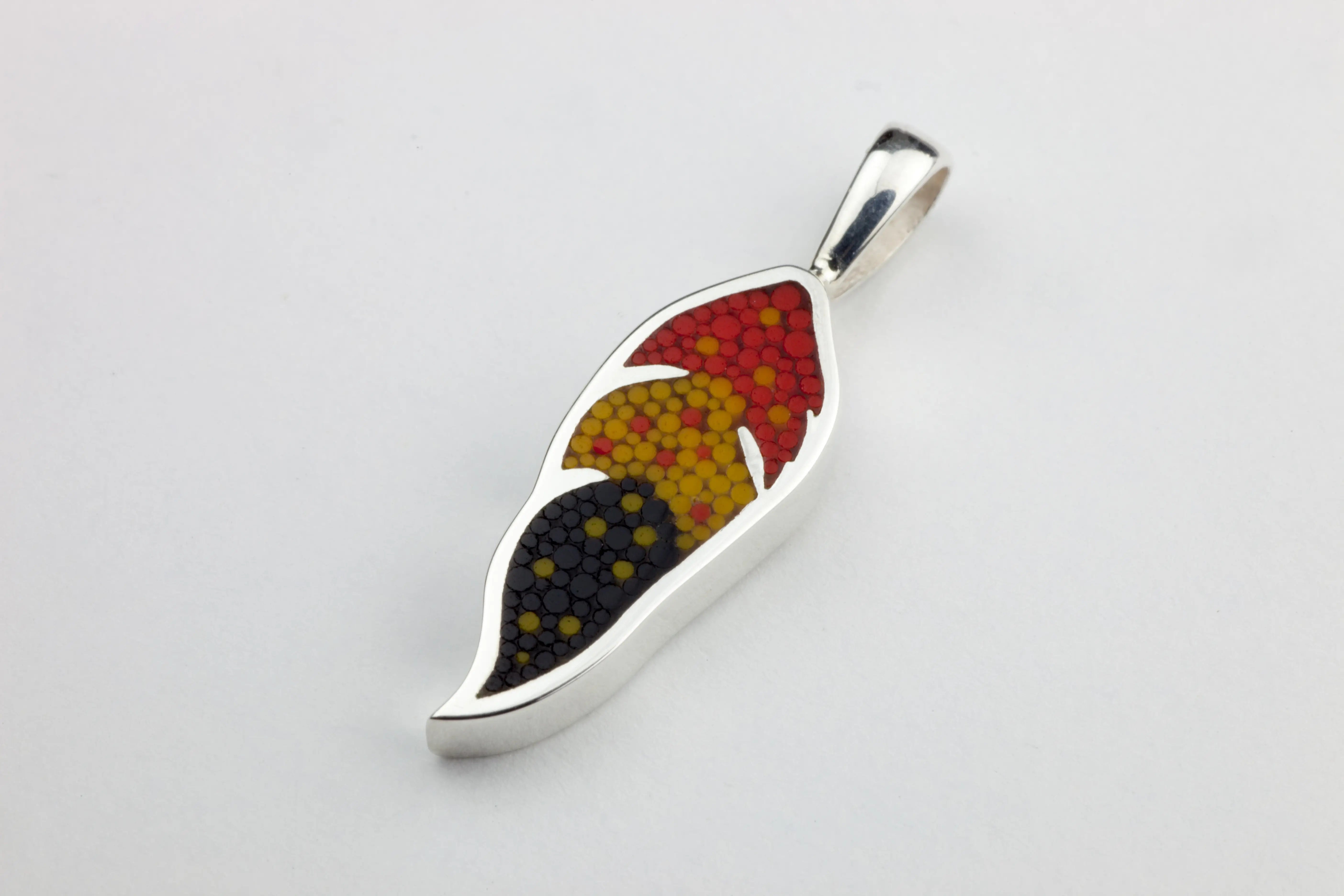 Pendentif Plume 14 en argent sterling et micro-mosaïque de verre, avec chaîne en argent sterling.
