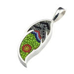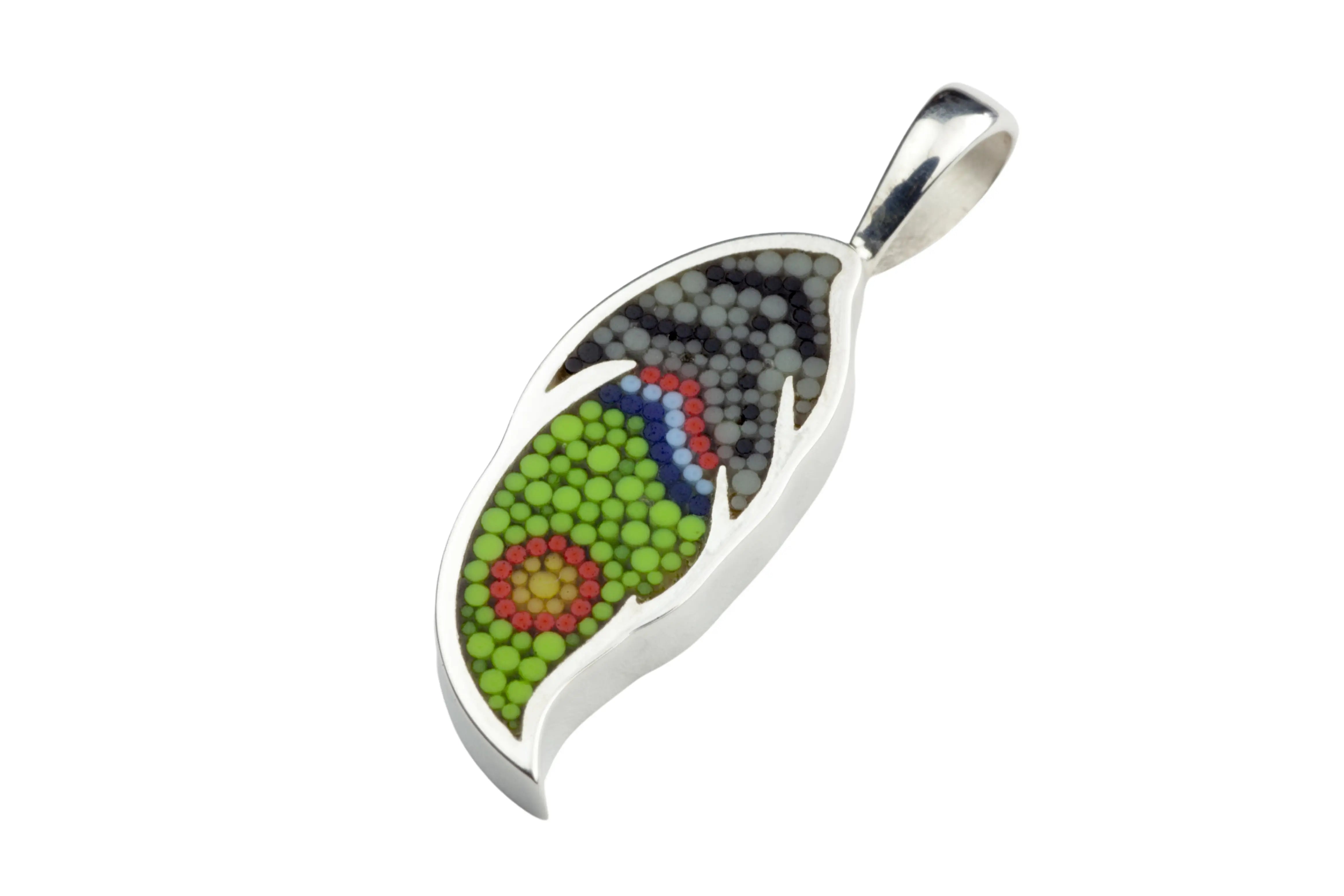 Pendentif Plume 17 en argent sterling et micro-mosaïque de verre, avec chaîne en argent sterling.