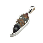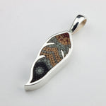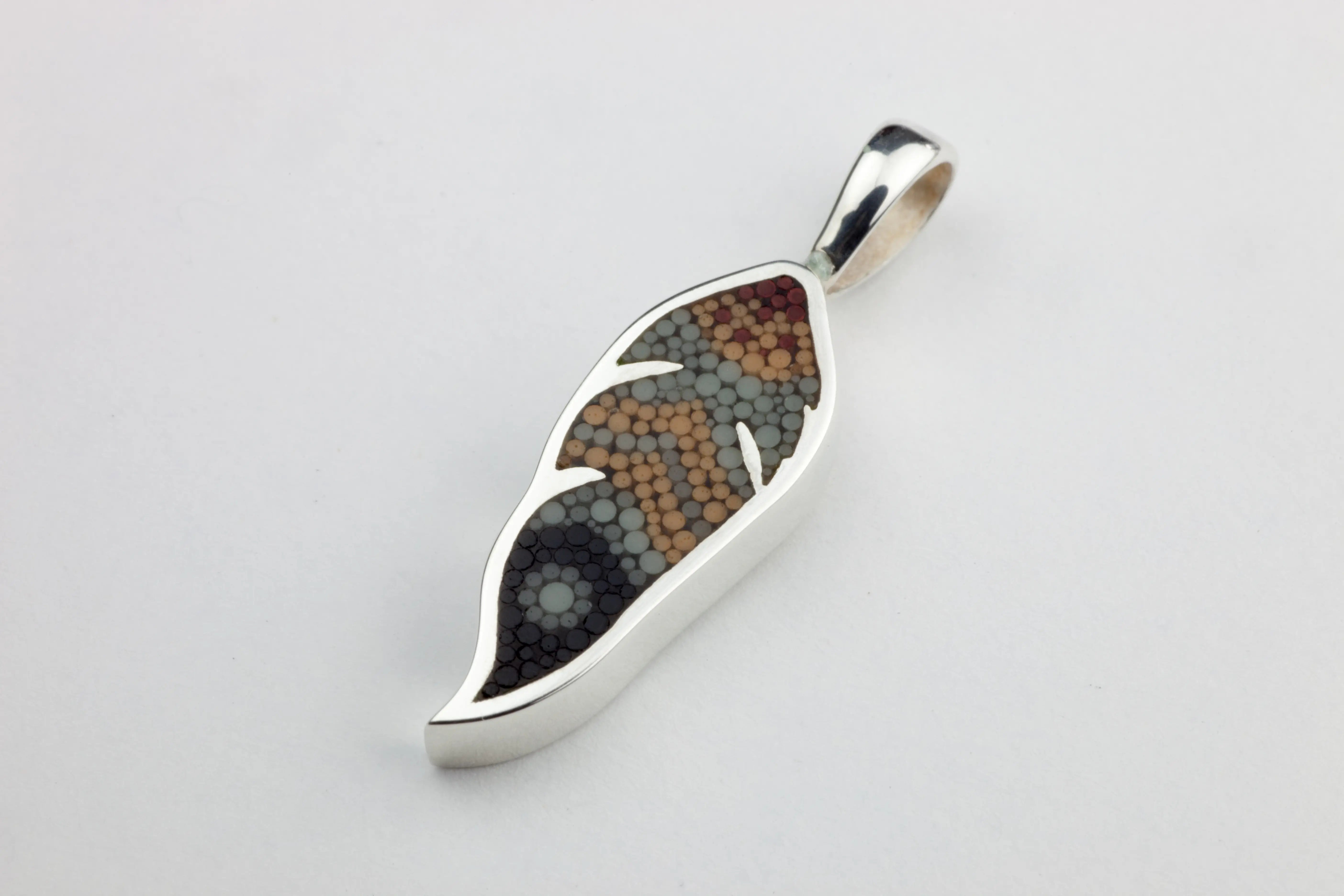 Pendentif Plume 4 en argent sterling et micro-mosaïque de verre, avec chaîne en argent sterling.