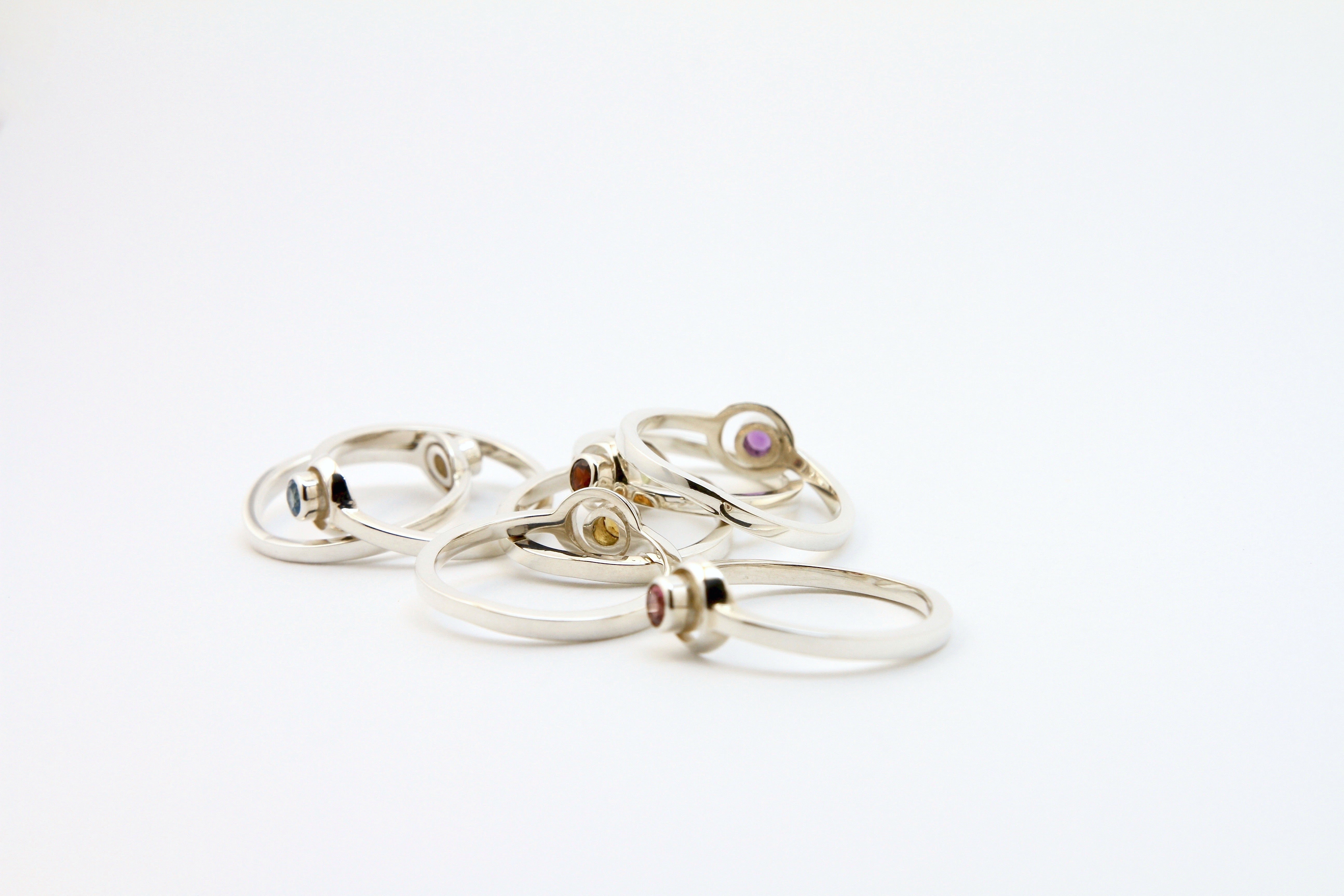 Chaque pierre naturelle – améthyste, citrine, topaze, tourmaline, péridot ou grenat – porte sa propre résonance : intuition, clarté, vision, ancrage, renouveau ou passion. L'argent sterling capte les reflets changeants de la lumière, créant un jeu subtil qui évolue avec votre journée.