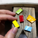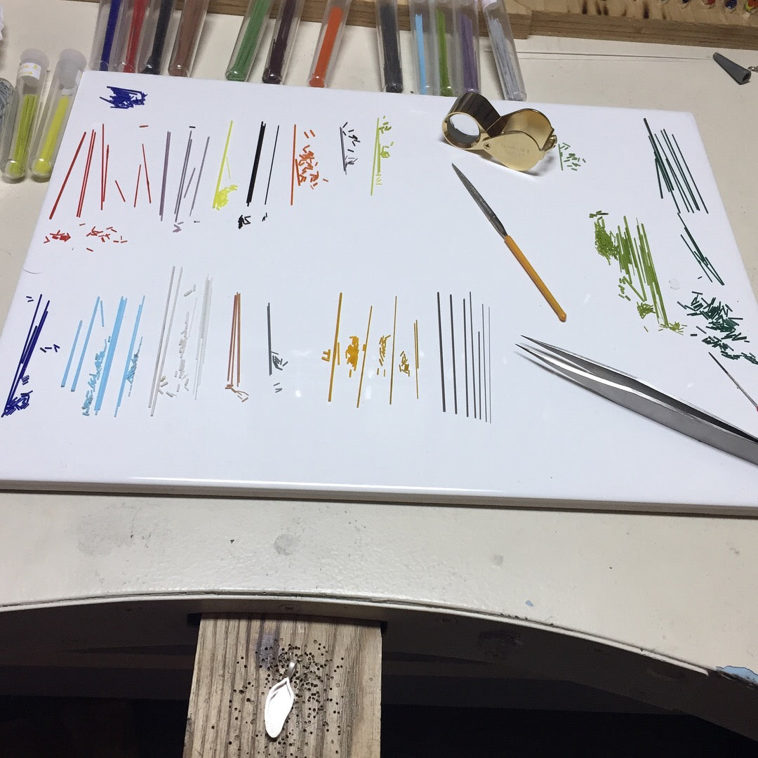 La micro-mosaïque est une technique artisanale italienne ancienne, qui consiste à travailler le verre au chalumeau pour l'étirer en fils ultra-fins, de moins d'un millimètre de diamètre. Ces fils sont ensuite coupés en petites sections de quelques millimètres, on les appelle "Tesserae".