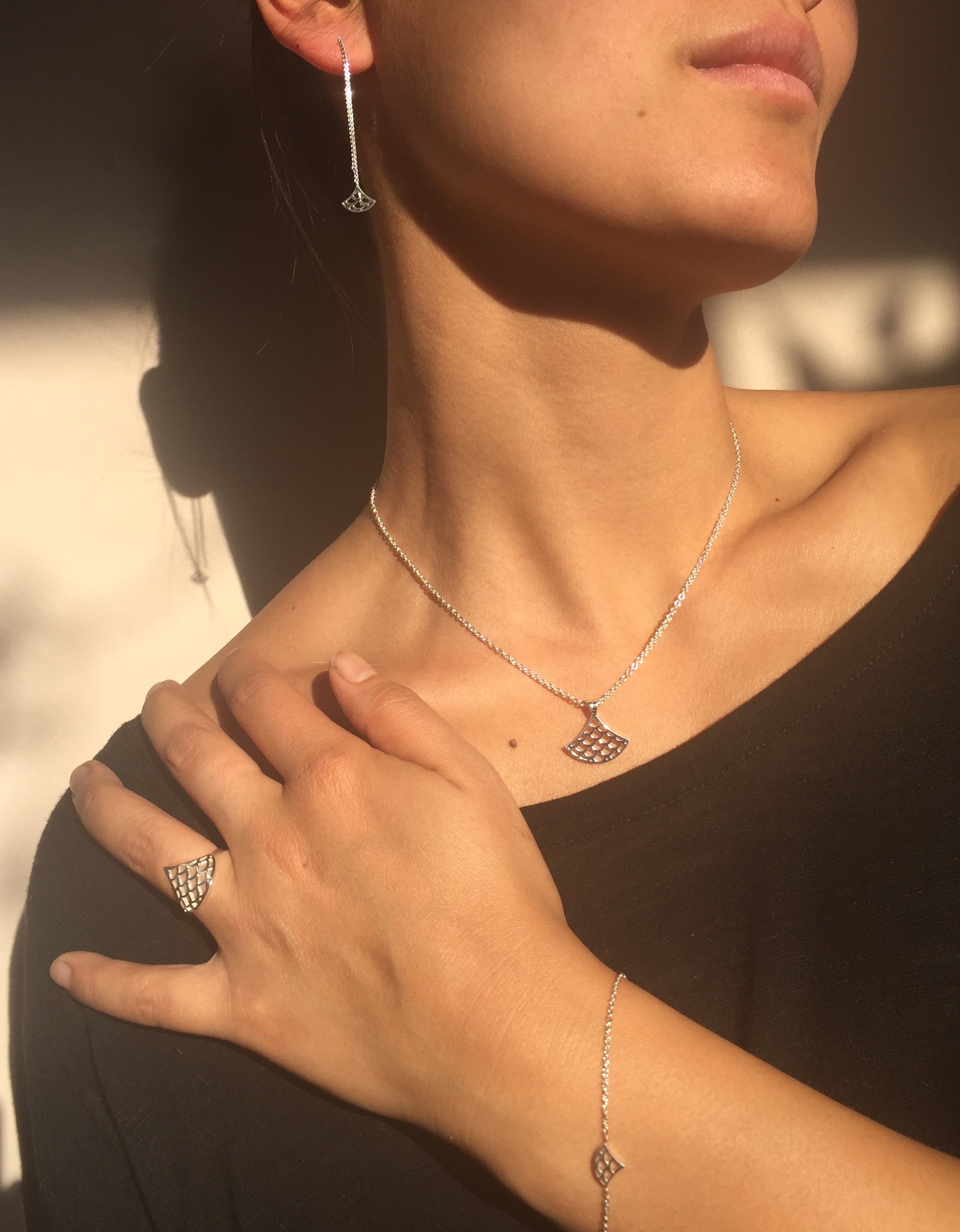 La collection Seigaiha transpose ce mouvement perpétuel en dentelle d'argent ajouré. Chaque pièce capture cette rythmique de l'eau : tout est flux, rien ne stagne. Porter ces vagues, c'est s'aligner avec les cycles naturels, accepter que l'abondance réside dans le mouvement lui-même.