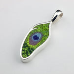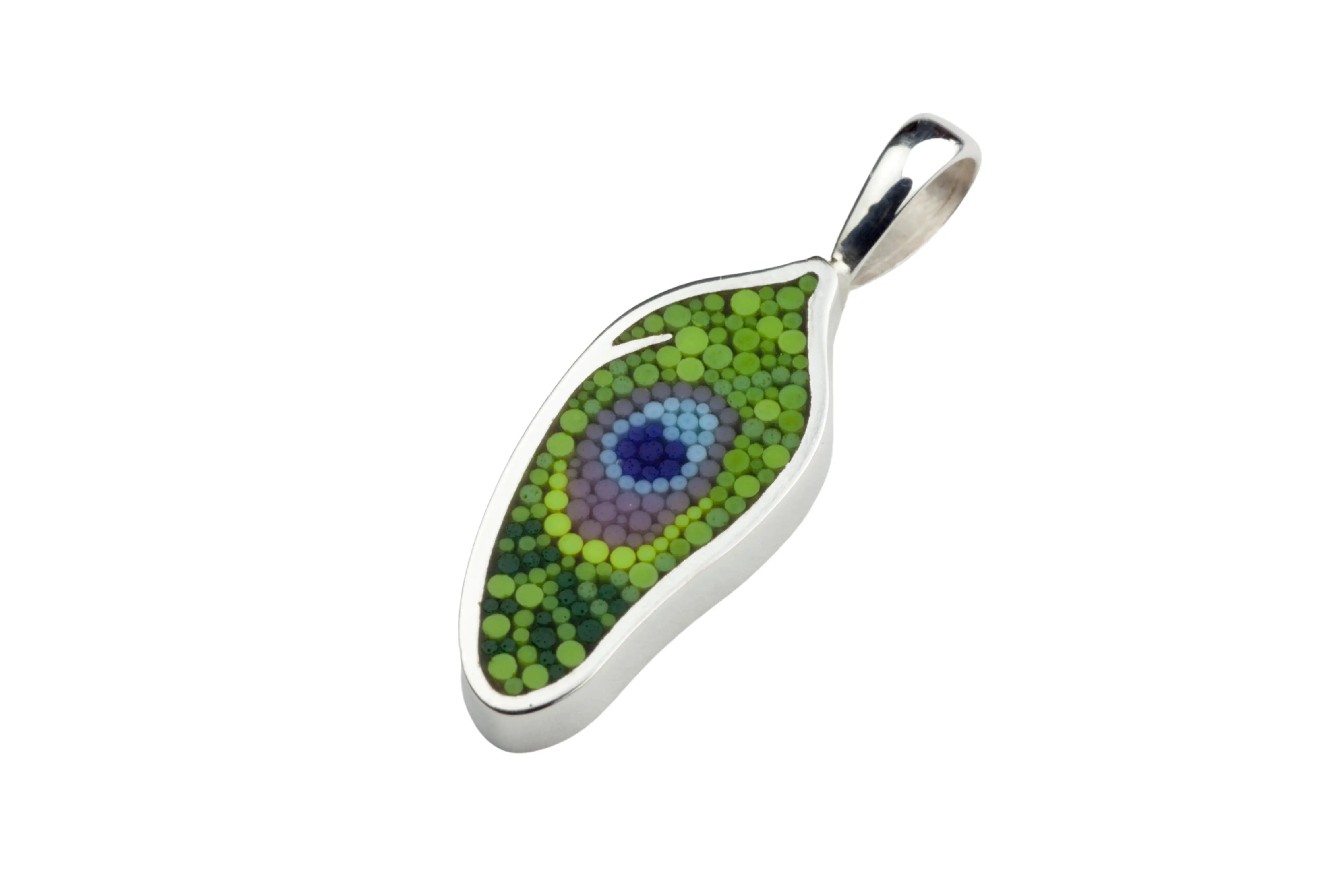 Pendentif Plume 13 en argent sterling et micro-mosaïque de verre, avec chaîne en argent sterling.
